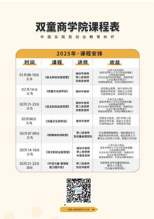 當(dāng)然,除了(le)現場課堂,還有(yǒu)創始(shǐ)人樓仲平老師的(de)主(zhǔ)題課程分享,更有分享結束後,還將以問答互動的形式為學員們解答(dá)參觀過程中疑惑、或者企業發(fā)展中遇到的問題,讓大家在研(yán)學活(huó)動中避免(miǎn)走馬(mǎ)觀花,真正找到“雙(shuāng)童”經(jīng)營(yíng)過程中的科學管(guǎn)理邏輯(jí),實現創業思維的升階!