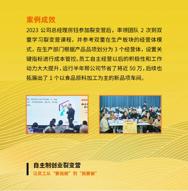 通過獨立核算、自負盈虧的獨立經營模式,孵化並培養內部經營(yíng)實體和創業實體(tǐ),賦能一批優秀管理者逐漸向經營者和創業者轉變。不斷通過全新探索,鼓勵有夢想、想創業的員(yuán)工協同創造,實現讓員工從“要我做”到“我要做”的轉變,開啟企業與員工追求“共同富裕”的全新篇章(zhāng)。