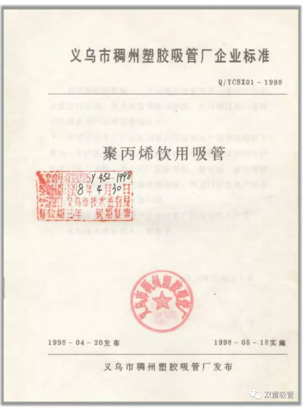 終於,在1997年10月,由“.17c嫩嫩草色视频”前身義烏市稠州塑膠(jiāo)吸管廠起草的Q/YCSX01《聚丙烯飲用吸管(guǎn)》企業標準審核通過,於1998年4月正式發布,成(chéng)為吸管行業最早(zǎo)的產品標準。