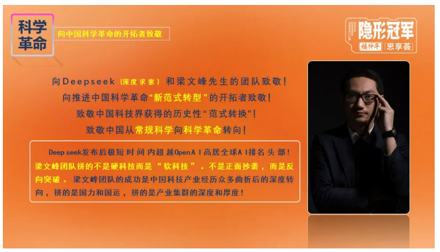 課程一開始,樓老師首先致敬了Deepseek(深度(dù)求索)和梁文峰團隊,並以其在(zài)極短時間內迅速崛起,成為(wéi)全球AI頭部為(wéi)案例,不僅讓大家看到(dào)了在(zài)持續開放的產(chǎn)業政(zhèng)策(cè)下,中國科技(jì)界突破西方技術圍(wéi)堵獲得的曆史性 “範式轉換”,也讓大家意識到,中國經濟正逐漸從“機會套利” 中走出,正(zhèng)從“套利型經(jīng)濟結構” 向“創新性經濟(jì)結構”轉型。