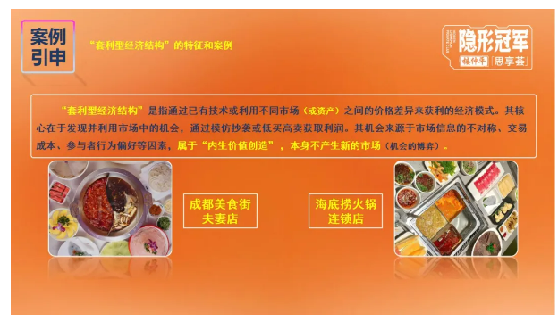 比如樓老師在課上提到的經典案例:開在成都街頭的夫(fū)妻火鍋店隻是在瓜分(fèn)原有的市場資源,並沒有創造出(chū)新的消費需求,所以屬於“套利型(xíng)經濟結構”;而同樣是火鍋,海底撈通過創新(xīn)研究,開發出了新的市場和客戶群體,所(suǒ)以屬於“創新型經濟結構”。