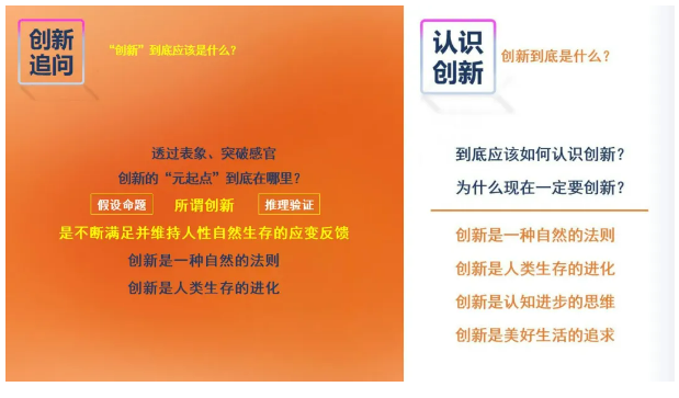 由(yóu)於第(dì)一天課程內容非常精(jīng)彩(cǎi)且豐(fēng)富,我們將分上下兩篇為大家呈現,本篇(piān)的知識點(diǎn)將圍繞“認識創新”和“理解創新(xīn)”兩(liǎng)部分展開,詳細為大家拆解:為什麽說能滿足人性內(nèi)在“喜新厭舊”的隻有(yǒu)“創新”,企業發展有效的增長引擎也隻有“創新”!