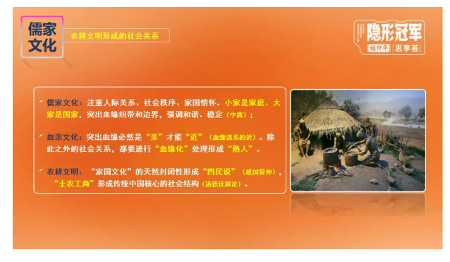 而且,“儒家”的話語多(duō)圍繞人倫關係展開,注重人際關係、社會秩序和家國情懷,以血緣(yuán)關係(xì)為紐(niǔ)帶,將“血親文化”“熟人文化”注入了(le)國(guó)人的基因,並形成了(le)森(sēn)嚴的倫理等級,即內外有別、上下有序和(hé)天下觀念(niàn),從(cóng)而達成社會的和諧、穩(wěn)定。“家國文化”的天然封閉性讓“士農工商”成為傳統中國核心的(de)社(shè)會結構(gòu),以農為本,重農抑商是基(jī)本國策,形成了與西方社會截然相反的主(zhǔ)流(liú)群體。