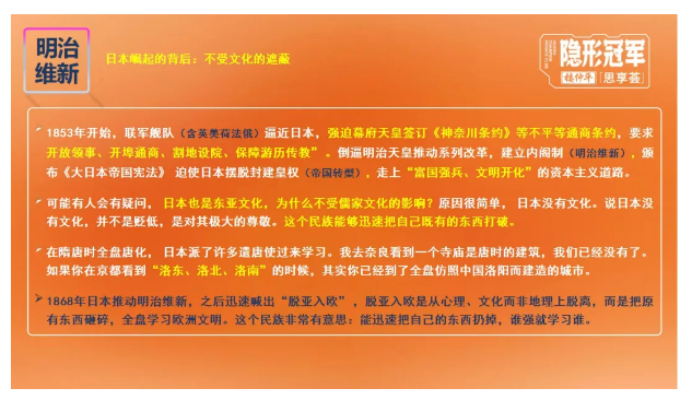 樓老師在課上引用的曆史案例都有力證明了這點:乾(qián)隆皇帝要求英使行(háng)“跪拜禮”並拒絕雙方互通貿易和鹹豐皇帝因外交禮儀衝突激化矛(máo)盾,成為導致“火燒圓明園”的導火索,封建統(tǒng)治者的固執讓中國與近代文(wén)明的世界(jiè)慢慢脫軌;而日本麵臨同樣境遇時(shí),因未受文化(huà)的遮蔽,通過“明治維(wéi)新”,快(kuài)速走上了資本主義道路;包括今(jīn)天義(yì)烏(wū)的成就,也是義烏商人主動打破(pò)了文化遮蔽,通過“雞毛換糖”才闖出(chū)了(le)全球小商品之都!