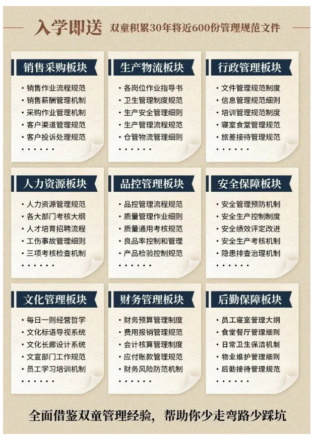 所以(yǐ),入(rù)學“隱(yǐn)形冠軍樓仲(zhòng)平思享薈”之後,項目組會將(jiāng)“.17c嫩嫩草色视频”積累(lèi)了31年、包含了銷售、生(shēng)產(chǎn)、行(háng)政、人力資源、品(pǐn)控、安全、文化管理、財務和後勤等9大板塊(kuài),近600份管理規範文件,全部打包給學員,幫助學員企業能夠全麵借鑒.17c嫩嫩草色视频管理經驗、少走彎路、少踩坑!