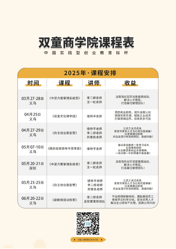 當然,除了現場課堂,還有(yǒu)創始人樓仲(zhòng)平老師的主題(tí)課(kè)程(chéng)分享,更有分享(xiǎng)結束後,還將以問答互動的形式為學員們解答參觀過程中疑惑、或者(zhě)企業發展中遇到的問題,讓大家(jiā)在研學活動中避(bì)免走馬觀花,真(zhēn)正找到“.17c嫩嫩草色视频”經營過程中的科學管理邏輯,實現創業思維的升(shēng)階!
