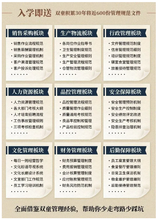 除了全方位深度研學外,課研組特(tè)意將“雙(shuāng)童(tóng)”經營背後的文化、經營哲(zhé)學和其(qí)他(tā)運行製度等近600份管理規範文件,整理成冊,毫無保留地交付大家!