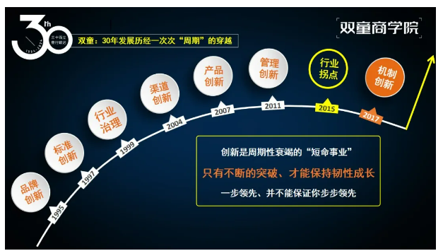 樓(lóu)仲平的自我突破(pò)和自我進化企業成長的背後是創業者的持續成長,雙(shuāng)童能夠一次次成功穿越周期的背後,正是創始人樓仲平個人持(chí)續成長、自我(wǒ)進化、行知合一的結果!