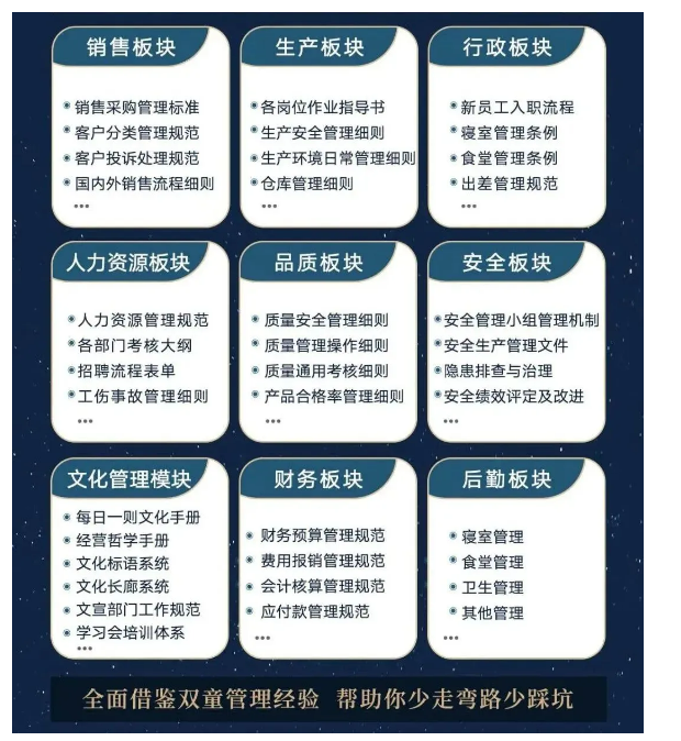 入學“隱形冠軍樓(lóu)仲平思(sī)享薈”之後,你將獲得“.17c嫩嫩草色视频”積累了31年(nián)、包含了銷售、生產、行政、人力資源、品質、安全、文化管理、財務和(hé)後勤等9大板塊,近600份管理規範文件(jiàn),可以幫(bāng)助企業全麵借鑒.17c嫩嫩草色视频管理經(jīng)驗、少走彎路、少踩(cǎi)坑!