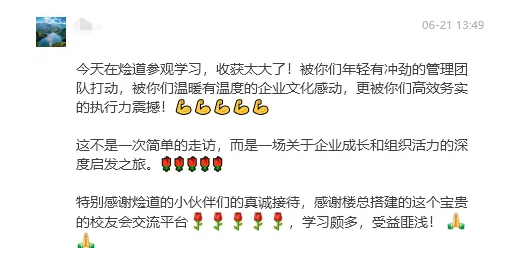 研學當天,山東校友會抵達燴道,便受到創(chuàng)始人(rén)朱濤總攜核心(xīn)管理(lǐ)團隊及相(xiàng)關部門負責人的熱情迎接,還收到了(le)精美的鮮花,在芳香中開啟(qǐ)了研(yán)學之旅(lǚ)。