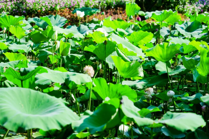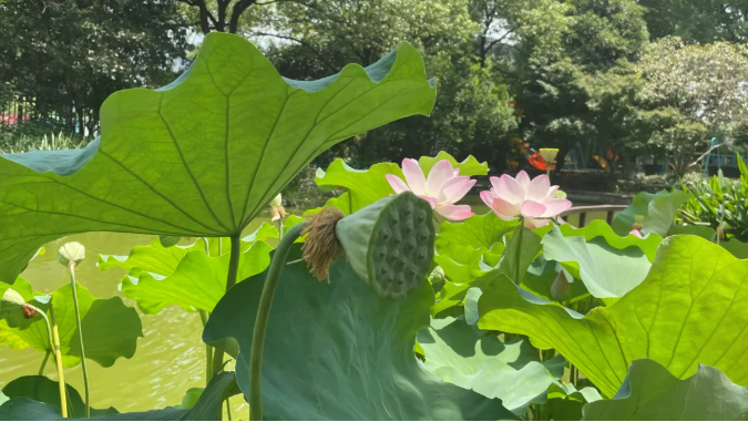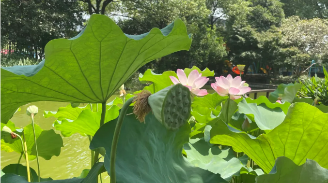 粉嫩的荷花亭亭玉立於層疊的綠葉(yè)之間,有重瓣的,有單瓣的,微風拂過(guò),不僅攜來縷縷清新的荷香,還撩動水麵,露出小小的蓮蓬,陽光斜照(zhào),為蓮花增添了一份光環。
