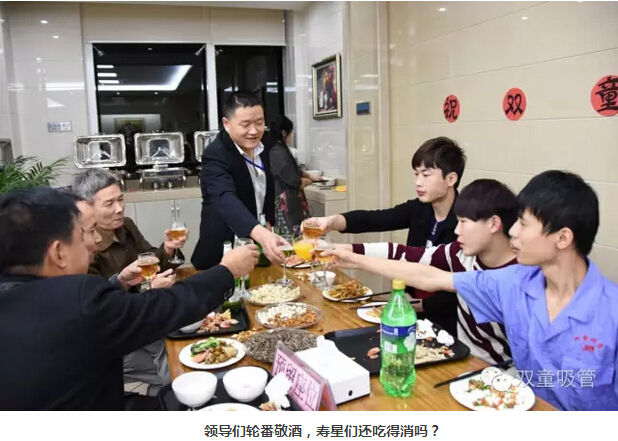 吃喝,吃喝,光吃不(bú)行還得喝!“酒水飲料”自然是調節氣氛的最佳,五星級食堂舉辦的第一次生日會,自然要幾位“五星級的領導”陪同!你看啊,各(gè)個車間的主要領導都來了(le)啊!他們的宗旨就是:一定要讓壽星們不光吃的好(hǎo),還要(yào)喝的盡(jìn)興!領導們端著酒(jiǔ)杯笑嘻嘻的對每位(wèi)壽星(xīng)說:“沒事,喝嘛,喝醉了明天(tiān)啥時(shí)候起來,啥時候上班!” 壽星們(men),你們還(hái)不趕緊放開了量,爭取也灌倒一兩位領導啊!!!