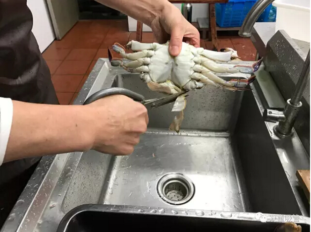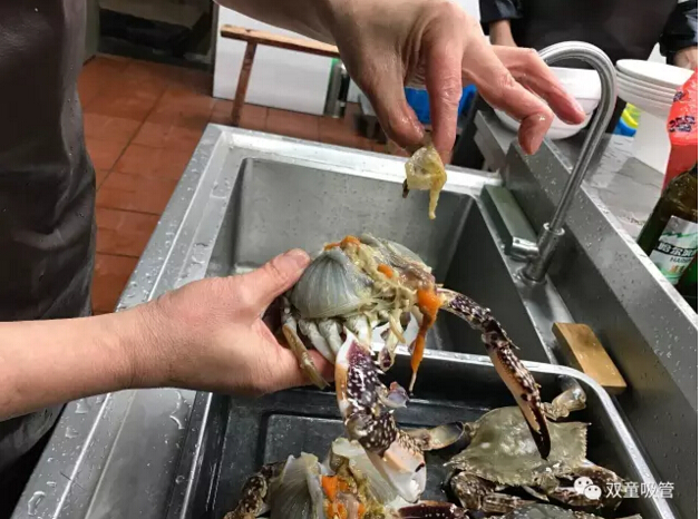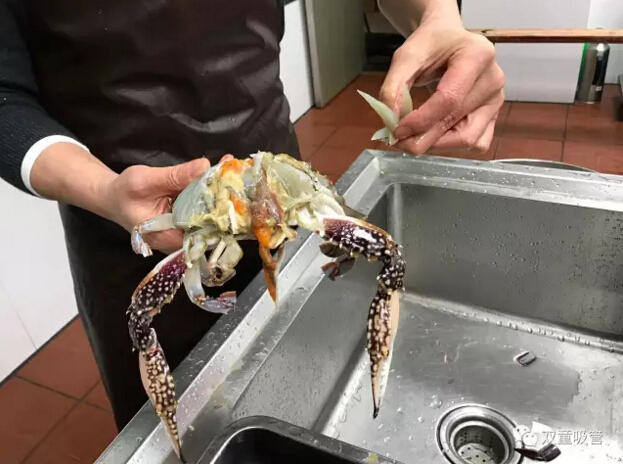 十二、取出砂囊後將(jiāng)蟹身兩側的蟹鰓(看上去(qù)像魚鰓)用手工拔除幹(gàn)淨,如果(guǒ)蟹鰓底部有烏(wū)黑砂子,千萬(wàn)不要用清水衝洗,用幹淨牙刷局(jú)部(bù)清洗一下就可以了。