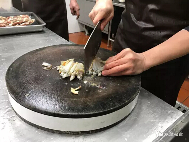 十三、螃蟹宰殺完畢後放菜板將(jiāng)蟹腳去除,大腳砍成(chéng)三段、小腳砍成兩段。