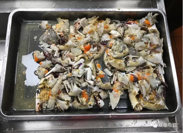 十七、螃蟹清洗宰殺完畢準備烹煮,宰殺後的螃蟹千萬千萬不能清洗了,連同黑乎乎湯汁(膏體)一(yī)並燒進去。